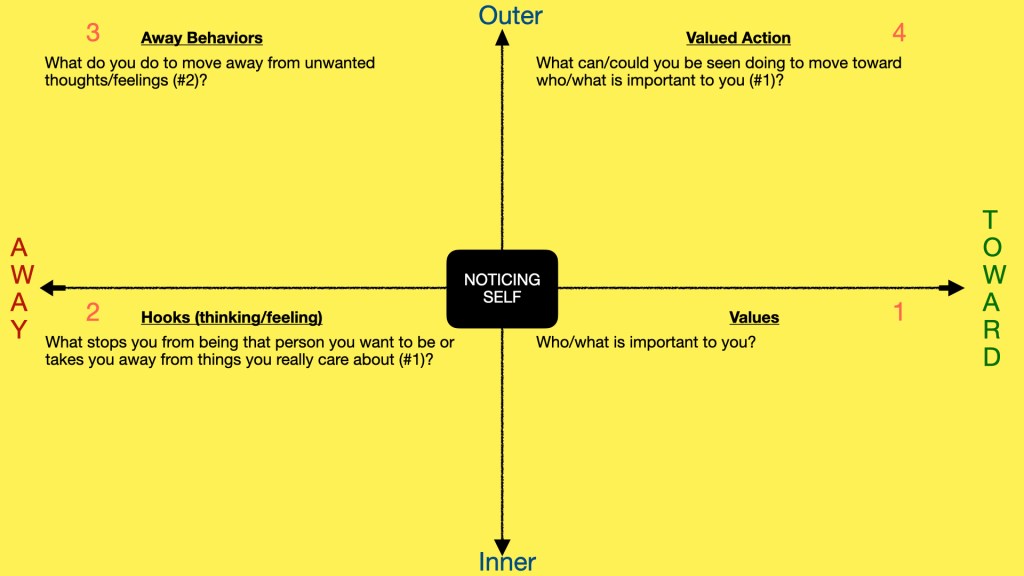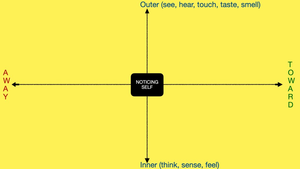 From the noticing self, we have a vertical arrow point “towards” and “away.” These directions represent moving towards or away from our values (i.e. what is important to us, how we want to live our lives).
