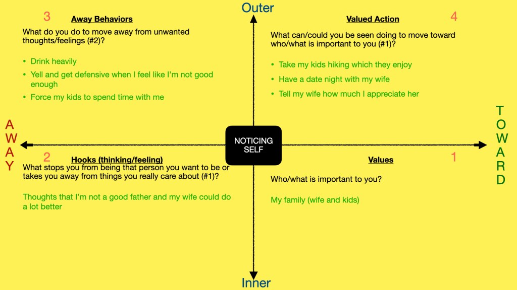 Moving to the upper right (4). This is where you would include those behaviors you could be seen doing to move toward your values (quadrant 1). I like to refer to these as “toward moves” as they move you towards your values.